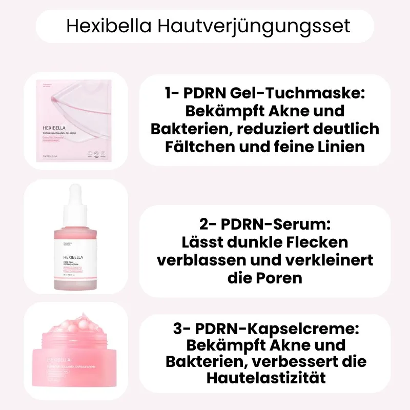 Unser PDRN-Set enthält 3 Produkte, die zusammen alle Ihre Hautpflegebedürfnisse abdecken. Unser PDRN-Paket bekämpft Akne und Bakterien, spendet Feuchtigkeit, verbessert die Hautstruktur und baut Kollagen und Elastin auf. So erhalten Sie mit nur 3 Produkten eine umfassende Lösung für eine gesündere Haut.