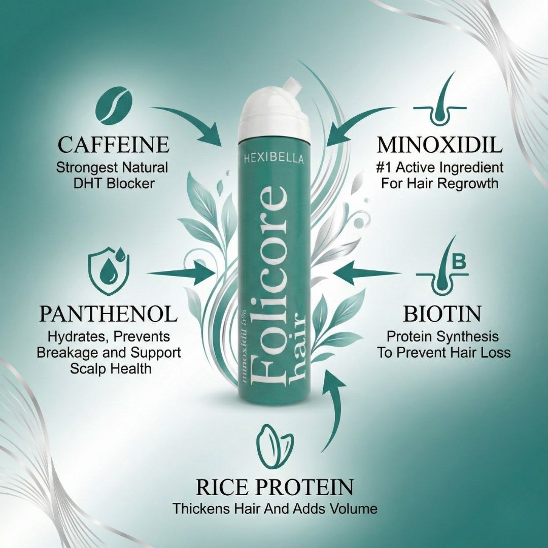 Folicore uses 5 ingredients instead of only using 5% minoxidil by itself. In addition to having 5% minoxidil, folicore uses high-dose caffeine as a DHT blocker, panthenol for scalp health, and biotin and rice protein for protein synthesis and improved hair thickness and volume. This formula uses more mechanisms for hair growth than normal minoxidil creating better faster results.